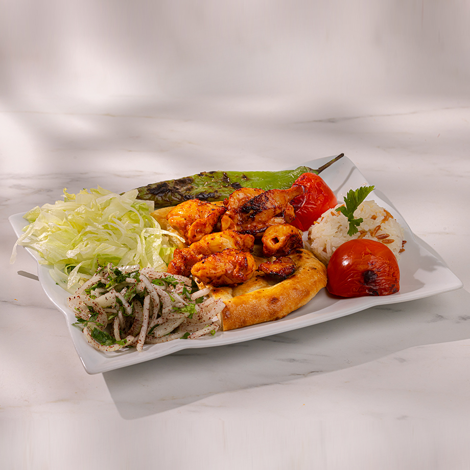 Süt kuzusu but; işlenmiş kuru soğan, yeşil salata, garnitür, pirinç pilavı, közlenmiş domates (yaz mevsiminde) ve közlenmiş biber (yaz mevsiminde) eşliğinde