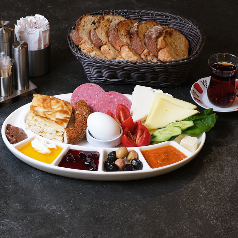 taze kaşar, siyah zeytin, yeşil zeytin, reçel, bal, kaymak, su