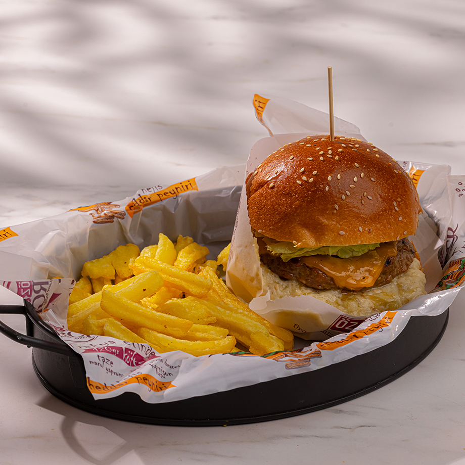 Trakya etinden 120gr hamburger köftesi, nefis cheddar peyniri, kıvamında patlıcan beğendi, taze marul yaprağı, karamelize soğan, kornişon turşu ve patates kızartması
