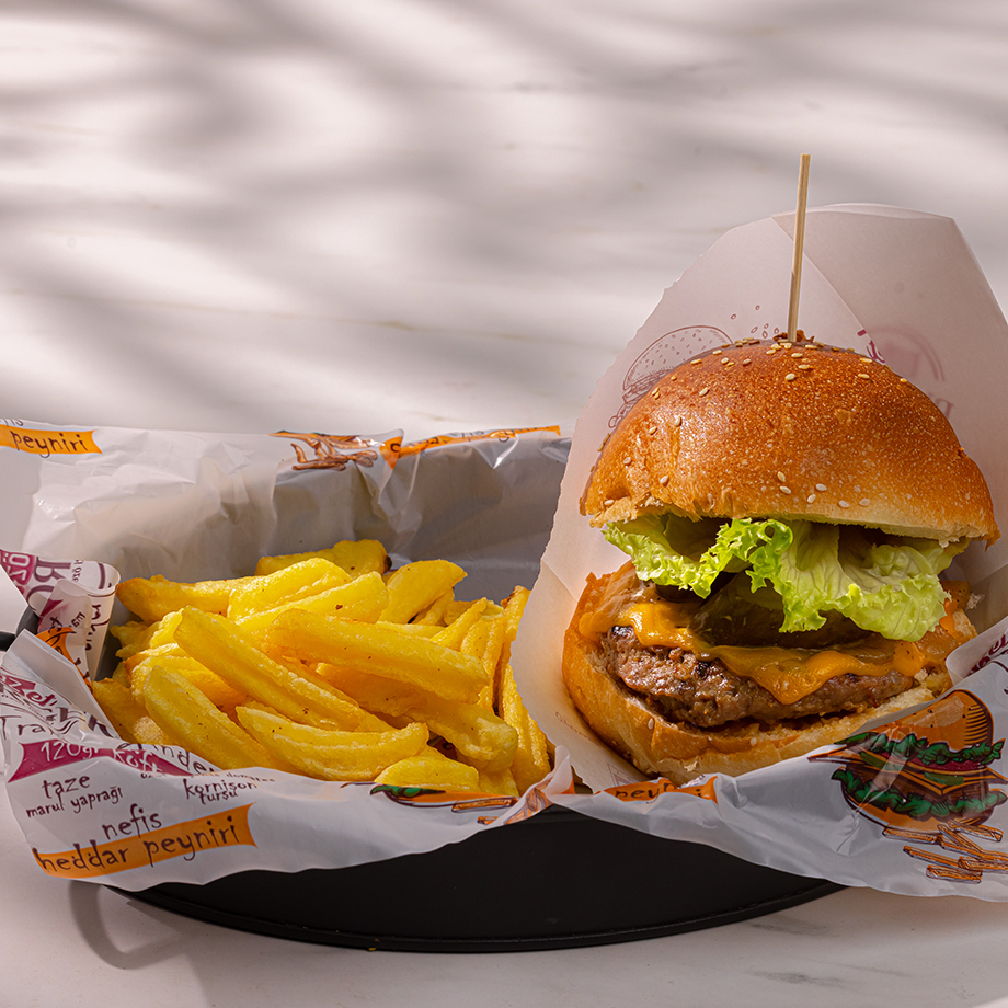 Trakya etinden 120gr hamburger köftesi, nefis cheddar peyniri, taze marul yaprağı, karamelize soğan, kornişon turşu ve patates kızartması