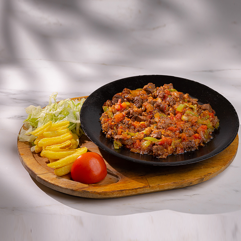 Dana eti, kuru soğan, domates, sarımsak, yeşil biber ve özel baharat karışımı ile sac tavada kavrulmuş dana eti; patates, marul, közlenmiş domates (yaz mevsiminde) ve közlenmiş biber (yaz mevsiminde) eşliğinde