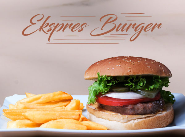 Trakya etinden 90gr hamburger köftesi, taze marul yaprağı, soğan dilimi, domates, kornişon turşu ve patates kızartması.