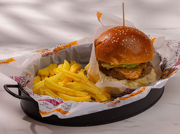 Trakya etinden 120gr hamburger köftesi, nefis cheddar peyniri, kıvamında patlıcan beğendi, taze marul yaprağı, karamelize soğan, kornişon turşu ve patates kızartması