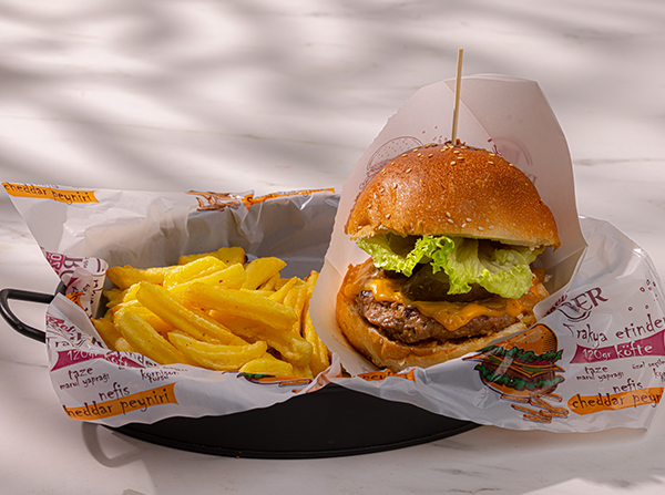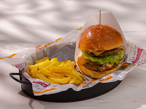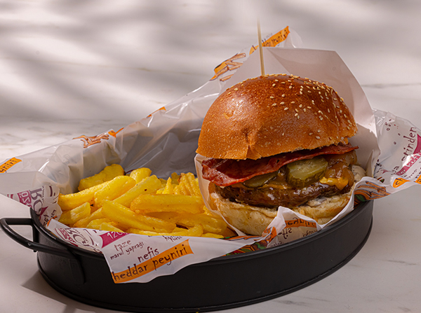 Trakya etinden 2 adet 120gr hamburger köftesi, 2 dilim nefis cheddar peyniri, taze marul yaprağı, karamelize soğan, kornişon turşu ve patates kızartması