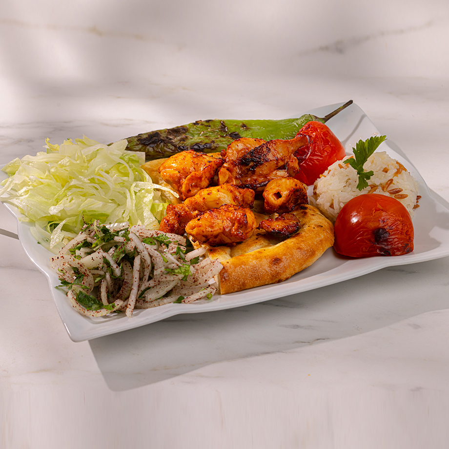 Özcanlar sosu ile işlenmiş tavuk but şiş; işlenmiş kuru soğan, yeşil salata garnitür, pirinç pilavı közlenmiş domates (yaz mevsiminde) ve közlenmiş biber (yaz mevsiminde) eşliğinde